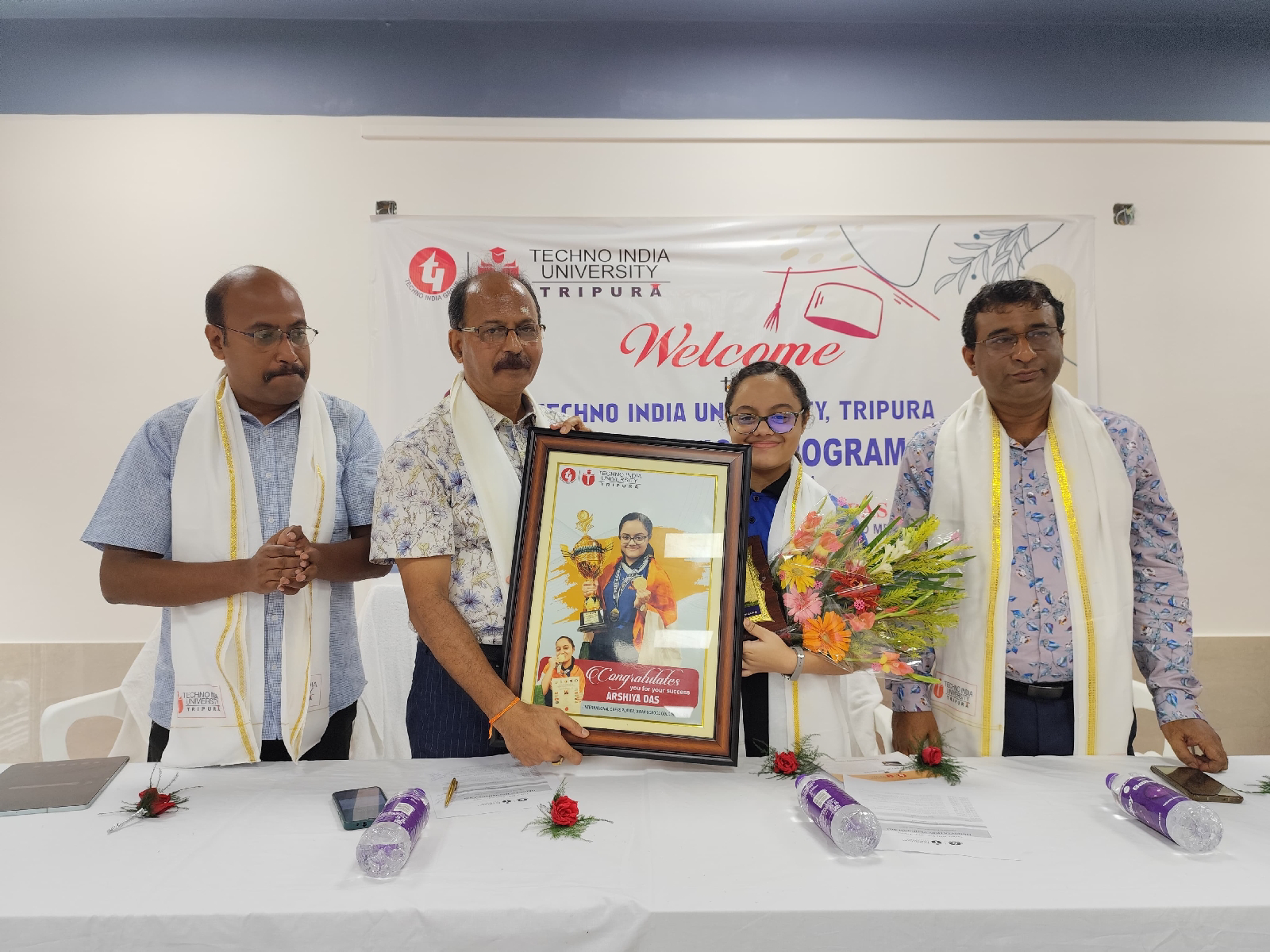 এদিন ইউনিভার্সিটি ক্যাম্পাসে পঠন পাঠনের অনুষ্ঠানকে সামনে রেখে একটি অনুষ্ঠানের আয়োজন করা হয়। এই অনুষ্ঠানে বিস্ময় আরশিয়া দাসকে সংবর্ধনা দিল টেকনো ইন্ডিয়া ইউনিভার্সিটি, ত্রিপুরা। অনুষ্ঠানে পুষ্পস্তবক দেওয়ার পাশাপাশি তার হাতে স্মারক এবং তার সাফল্যের অঙ্কিত একটি ছবি দিয়ে তাকে সংবর্ধনা দিল । শুধু তাই নয় আরশিয়ার গর্বিত পিতা-মাতাকেও সংবর্ধনা জানালেন টেকনো ইন্ডিয়া গ্রুপ। অনুষ্ঠানে আরশিয়া দাবার প্রসার ঘটানোর জন্য একটি দাবা বোর্ড উপহার দেন ইউনিভার্সিটি উপাচার্য প্রফেসর ডঃ রতন কুমার সাহাকে। এদিন টেকনো ইন্ডিয়া ইঞ্জিনিয়ারিং কলেজের তরফ থেকেও তাকে সংবর্ধনা দেওয়া হয়। অনুষ্ঠানে উপস্থিত ছিলেন কলেজের প্রিন্সিপাল ডঃ দিবাকর দেব। আরশিয়ার সংবর্ধনা অনুষ্ঠানে টেকনো ইন্ডিয়া ইউনিভার্সিটির উপাচার্য প্রতিশ্রুতি দেন ভবিষ্যতে বড় কোন ইভেন্টে আরশিয়া অংশ নিলে টেকনো ইন্ডিয়া গ্রুপ সহযোগিতার হাত বাড়িয়ে দেবেন। শুধু তাই নয় ভবিষ্যতে উচ্চ শিক্ষার জন্য আরশিয়া যদি টেকনো ইন্ডিয়া ইউনিভার্সিটিতে ভর্তি হতে চান তা হলেও ইঞ্জিনিয়ারিং কলেজ এবং ইউনিভার্সিটির পক্ষ থেকে সাহায্যের হাত বাড়িয়ে দেওয়া হবে বলে জানিয়েছেন ইউনিভার্সিটির উপাচার্য ও কলেজের অধ্যক্ষ্য ড: দিবাকর দেব।